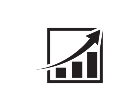 Business growth icon, bar chart increasing with arrow up, filled flat glyph style, vector icon for finance apps, modern minimal design, black and white