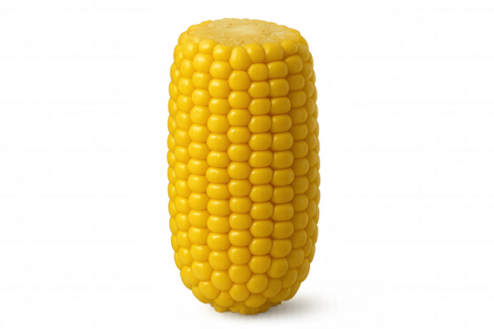 Yellow corn cob displaying plump kernels, ripe and glossy, cut from fresh ear against clean transparent background, highlighting natural golden color