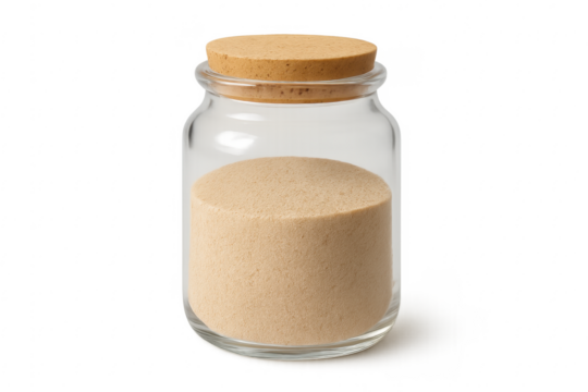 Glass jar filled with yeast powder, cork top