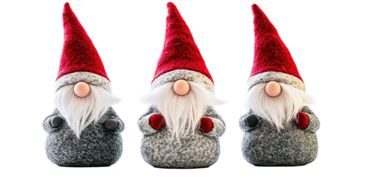 Three adorable christmas gnomes isolated on transparent background, each with unique hats and charming facial expressions, perfect for holiday decor