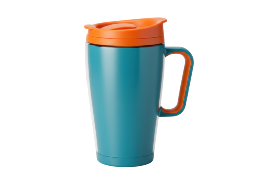 Isolated turquoise travel mug with handle and orange lid ready for on the go lifestyle