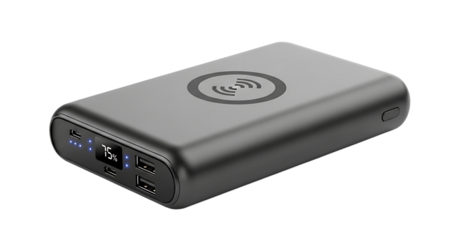 Modern Power Bank: Sleek, compact power bank showcasing cutting-edge charging technology for staying connected on the go. with wireless charging capability