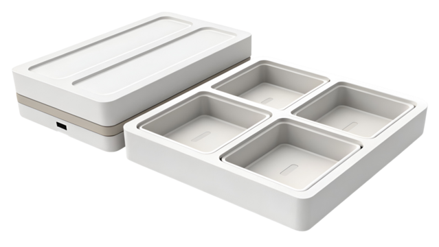Lunch Box with Compartments: A modern, minimalist lunch box, segmented into organized compartments, perfectly designed for a balanced and stylish meal on the go.