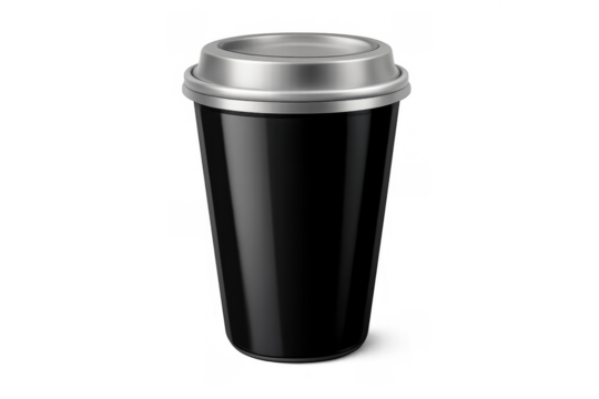 Black takeaway coffee cup with a silver lid. Design template for branding. Disposable for hot or cold drinks. Transparent background