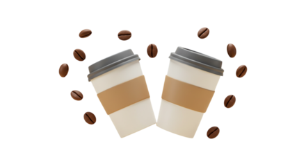 Two to go coffee cups surrounded by coffee beans on a transparent background