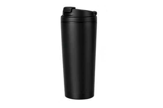 Black matte stainless steel travel mug, a reusable coffee cup or water bottle, providing insulation for drinks on the go