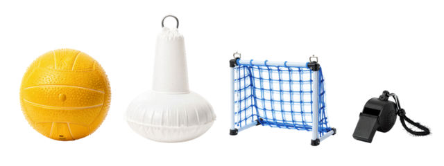 Photograph of a yellow textured volleyball, white inflatable goalpost, blue plastic goal net, and black sports bag.