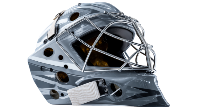 Close up of a modern ice hockey goalie mask on a white background