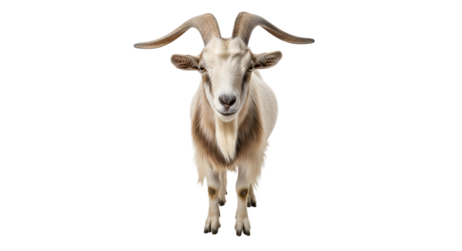 Front view of a male goat with long curved horns isolated PNG with Transparent Background