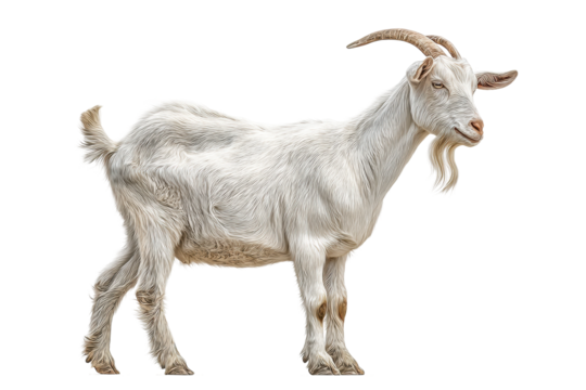 White goat standing on profile, showcasing its detailed fur and long horns on a transparent background, animal cutout