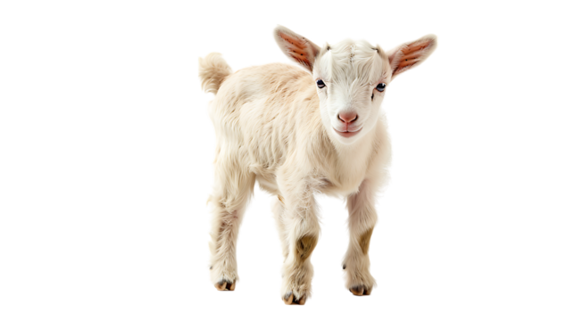 Adorable baby goat standing on a white background. High-quality stock photo, perfect for designs requiring cuteness, purity, and innocence. Ideal for print, social media, and projects, agriculture
