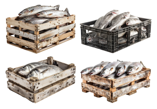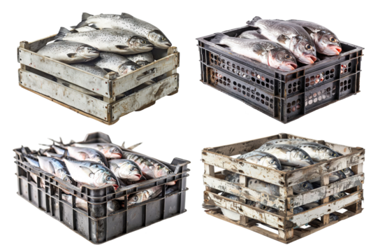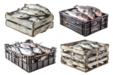Set of freshly caught fish packed in plastic and wooden crates, cut out