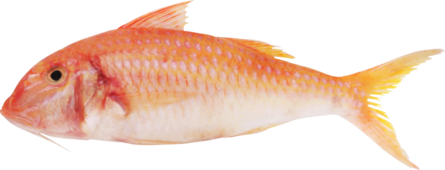 Striped Red Mullet (Mullus surmuletus) PNG, transparent background, red and white scales.