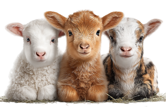 Three baby goats posing together on hay isolated  on transparent background