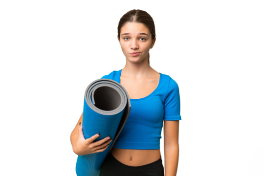 Teenager caucasian girl going to yoga classes while holding a mat over isolated background with sad expression