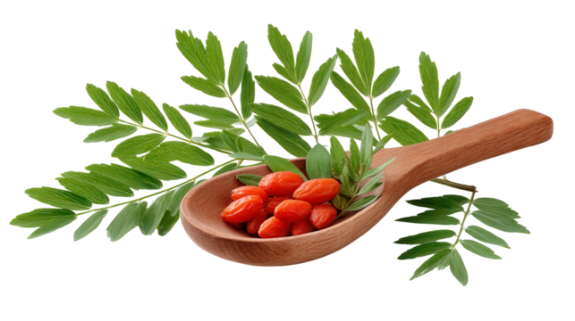 A Pile of Goji Berries With a Green Leaf on Top. On a White or Clear Surface PNG Transparent Background.