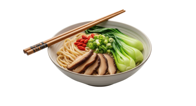 A bowl of ramen with bok choy mushrooms and goji berries with chopsticks on transparent background