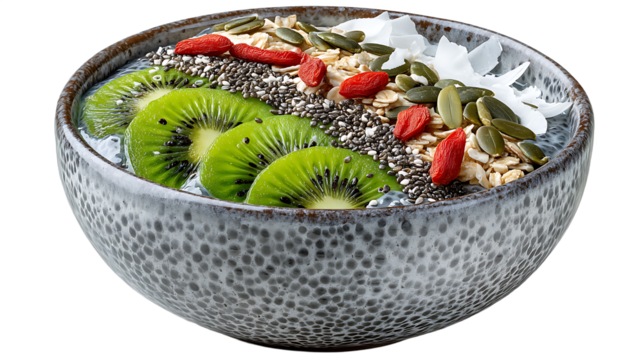 Healthy Smoothie Bowl With Kiwi, Goji Berries, And Chia Seeds On A Transparent Background