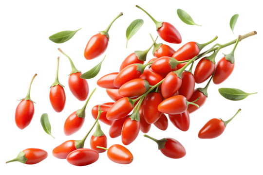 A vibrant branch laden with ripe red goji berries and green leaves isolated on transparent background