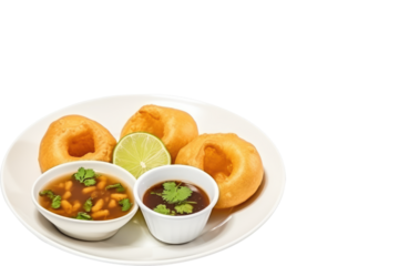 Delicious north and south indian street food pani puri gol gappa with tamarind water served in white plate on transparent background