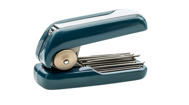 Stylish vintage teal blue stapler with exposed metal staples and gold accent featuring a retro office design on transparent background
