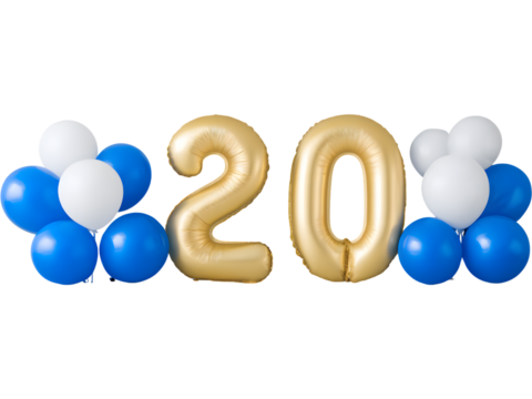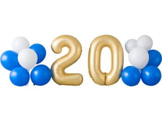 20th celebration gold balloons with blue and white colors isolated on transparent background, representing joy and festivity.