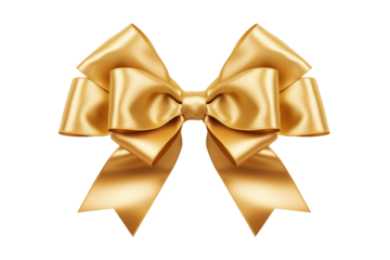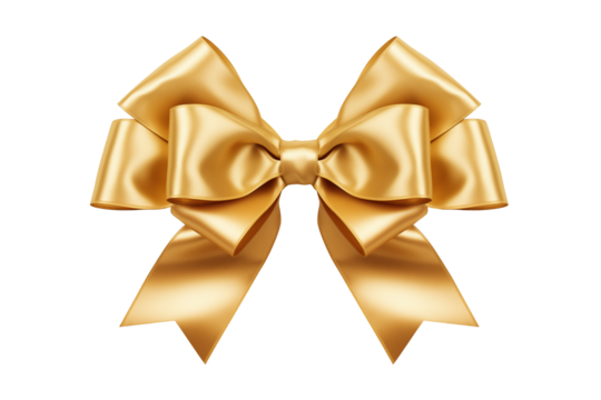 A luxurious gold bow with smooth ribbons, elegantly styled and displayed on a clean white background, perfect for special occasions and gifts.