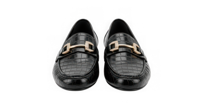 Black crocodile loafers with gold buckle on  isolated on transparent background.