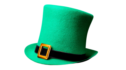 Green top hat with a shiny finish and a black band featuring a gold buckle ready for compositing on white and transparent background