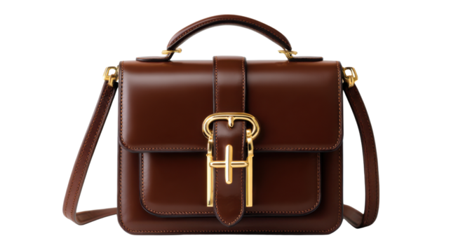 Brown leather handbag featuring a prominent gold buckle, classic satchel design, expensive fashion accessory, transparent background