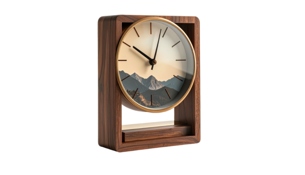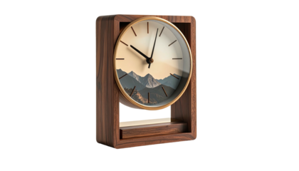 A wooden clock features a mountain scene on its face