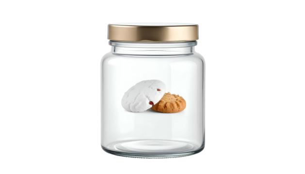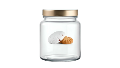 A glass jar with a gold lid holds two items, a white cloud-like shape and a round, brown cookie