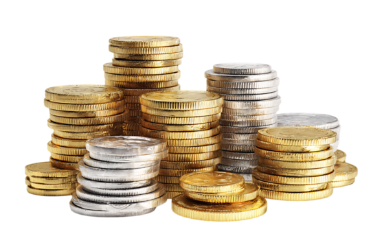 A towering pile of glistening gold coins, perfect for adding a touch of wealth and luxury to your designs. The transparent background allows for seamless integration into any project