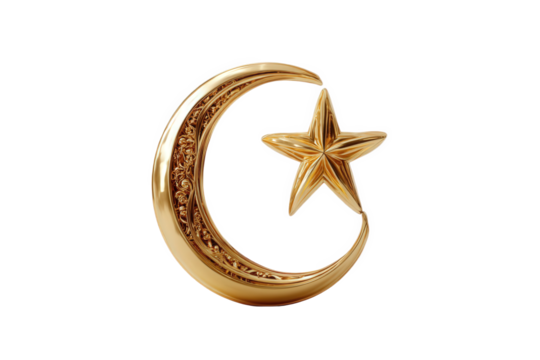 Golden crescent and star ornament isolated on transparent background
