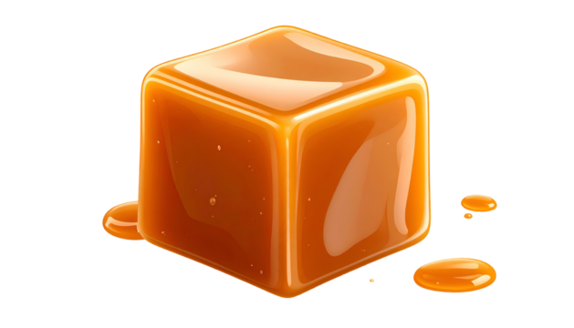 Close-up of a glossy, square caramel candy, with small drips on a black background