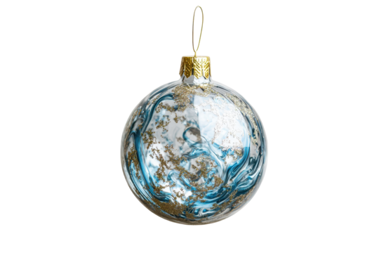 Decorative glass Christmas ball ornament with blue and gold design hanging against a neutral background ready for holiday celebrations