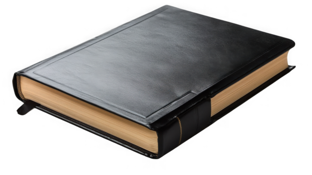 A closed black leather book with gold edged pages rests on a black surface in a studio setting on transparent background
