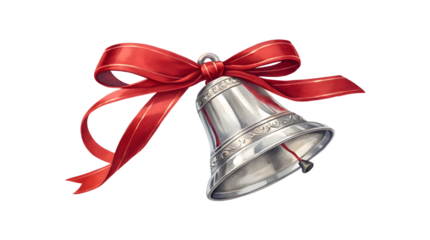 Polished silver bell with engraved details, tied with vibrant red ribbon bow with gold edges on transparent background.