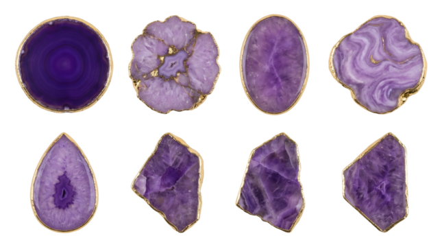 Purple agate slice set including round, oval, heart, and organic stone shapes with gold edges isolated. Luxury crystal jewelry and decor collection.