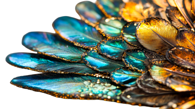 Plume with Teal and Gold Edges, Ornate, close up, cut out transparent