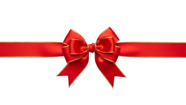 Red satin bow with gold edges and horizontal ribbon strip across, perfect for gifts, festive decoration, and celebration designs
