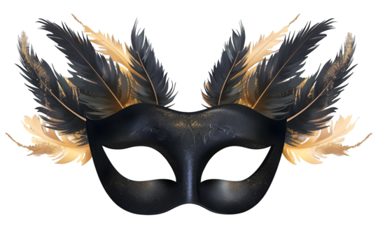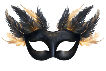 Elegant venetian masquerade ball mask with gold feather and rhinestone embellishments isolated on transparent background