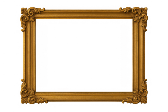 Elegant Antique Gold Picture Frame with Intricate Floral Carvings and Decorative Corners Isolated on White Background for Fine Art Display