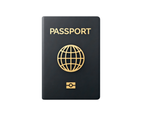 Dark blue passport with gold globe icon on cover on transparent background, PNG