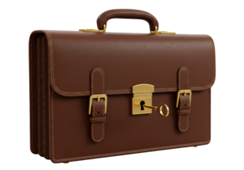 Isolated Elegant Brown Leather Briefcase with Gold Key and Buckles
