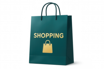 Shopping bag displaying gold logo, standing upright against transparent backdrop