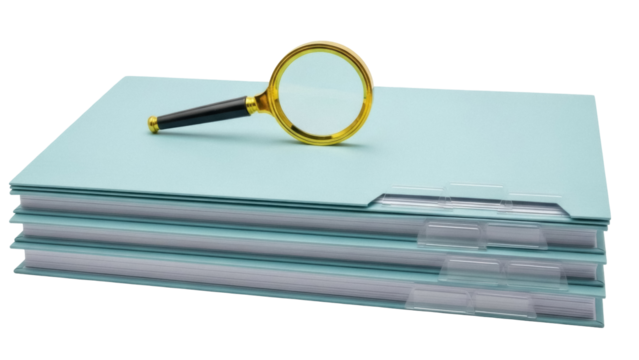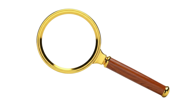 Gold magnifying glass with wooden handle finding, searching, researching, and investigating on transparent background
