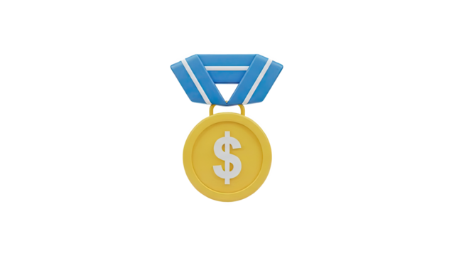 3D Rendered Gold Medal with Dollar Sign and Blue Ribbon