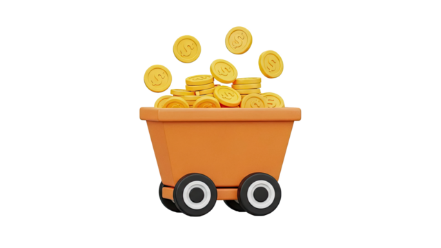 Orange mine cart overflowing with gold coins on transparent background
