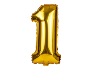 Set of shiny gold foil number one balloons, isolated on transparent cutout background